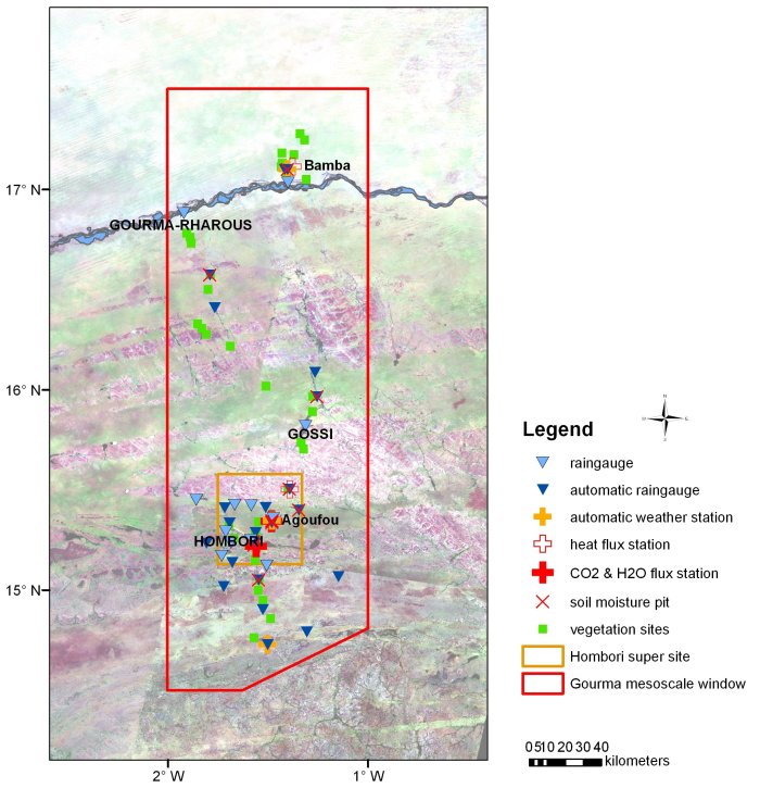 The Gourma mesoscale site (Mali) is part of the mesoscale observation network of the AMMA-CATCH observatory. Various instruments have been deployed there since 1984, in order to monitor the water cycle and vegetation dynamics. Their distribution is shown on the map below [observation period : 2004-2011]. An interactive map of the instruments at different scales is available on the AMMA-CATCH database portal.