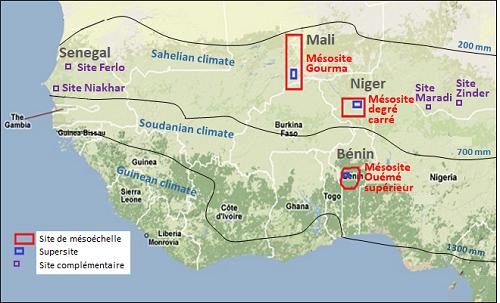 L’observatoire s’appuie depuis 1990 sur 3 sites de méso-échelle (≈100x100 km²) pour documenter le gradient climatique Nord-Sud caractéristique de la région. Sur chaque site de méso-échelle (en rouge sur la carte), on réalise des observations plus fines sur des "supersites" (en bleu sur la carte). Liste des meso-sites et supersites.