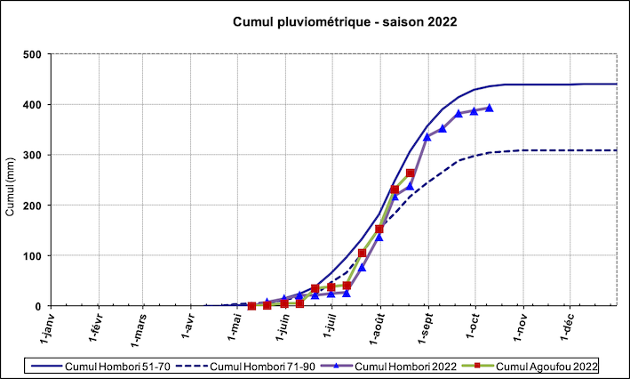 Évolution de la pluie cumulée depuis le début de l’année aux stations d’Agoufou et Hombori (Mali) et comparaison avec la moyenne inter annuelle des périodes sèches (71-90) / humides (51-70).