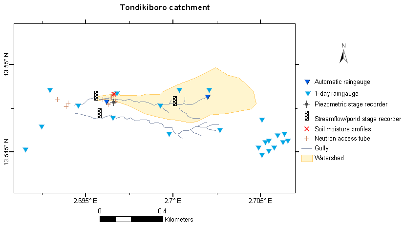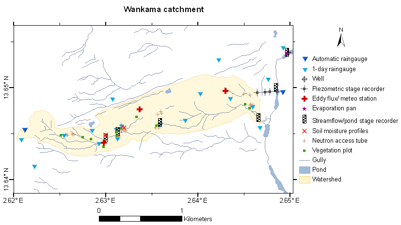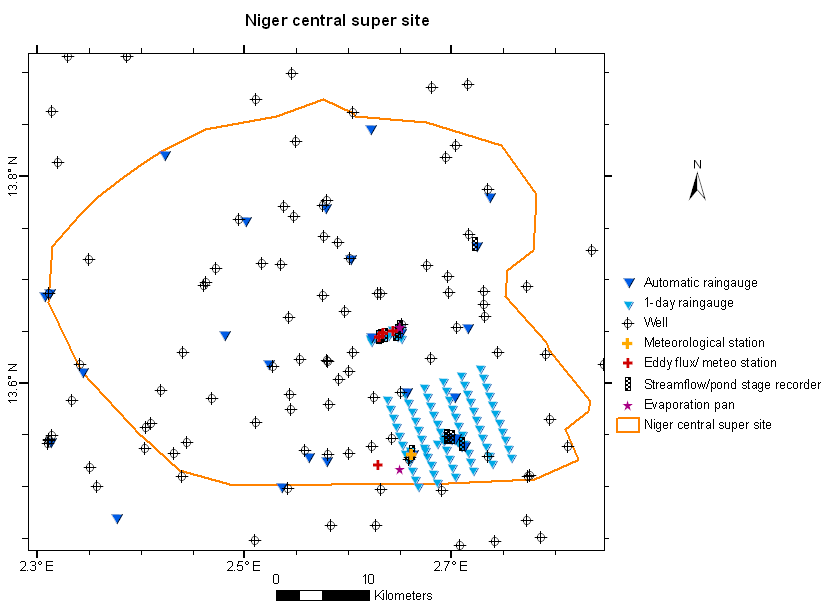 The Niamey Square Degree mesoscale site (Niger) is part of the mesoscale observation network of the AMMA-CATCH observatory. Various instruments monitor the water cycle and vegetation dynamics since the Hapex-Sahel experiment in 1990 (Goutorbe, Lebel et al., 1994). Their distribution is shown on the map below. An interactive map of the instrument at different scale is available on the AMMA-CATCH database portal.