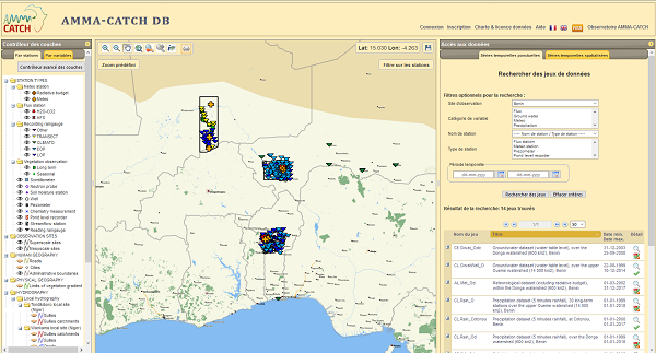 Ce portail permet de consulter et télécharger les données de l’observatoire AMMA-CATCH. Il est doté d’une interface cartographique qui permet de visualiser la position des stations de mesures et de trouver ainsi plus facilement les données d’intérêt.